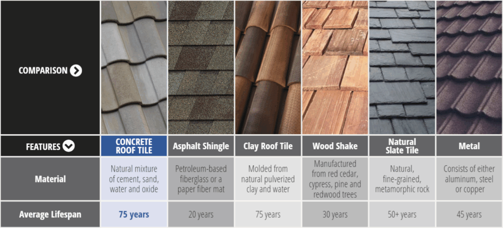 Lifespan varies by material: asphalt shingles last 20–30 years, metal lasts 40–70 years, and slate or tile can last over 100 years with maintenance.